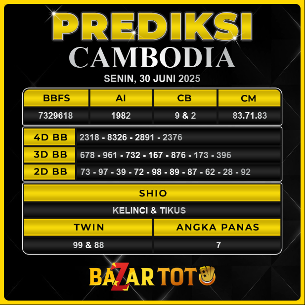 Prediksi CAMBODIA Hari Ini BAZARTOTO – Togel CAMBODIA Tutup jam 11:30 dan Pengumuman Keluaran jam 11:50.