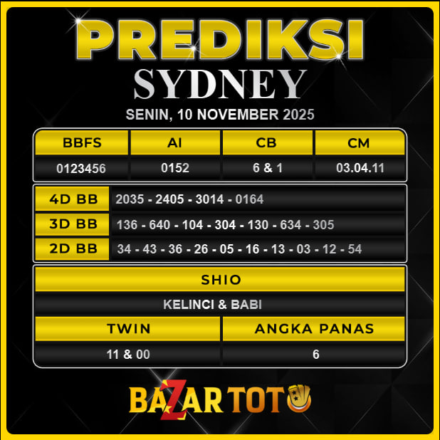 Prediksi SYDNEY Hari Ini BAZARTOTO – Togel SYDNEYTutup jam 11:30 dan Pengumuman Keluaran jam 11:50.